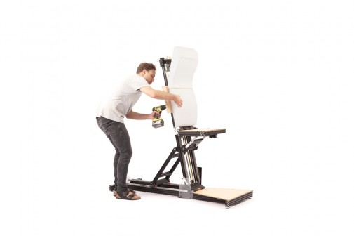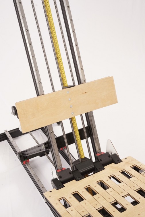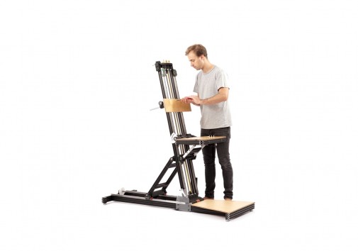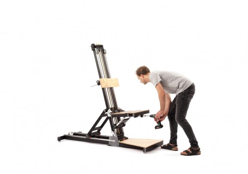 Pierwszy prototyp został wykonany ze sklejki (plywood), drewna i prostych elementów z marketu. Zbudowany został wokół warsztatowego słupa podporowego z prowadnicą typu „sanie”, które przesuwają się po nim, umożliwiając swobodną konfigurację.