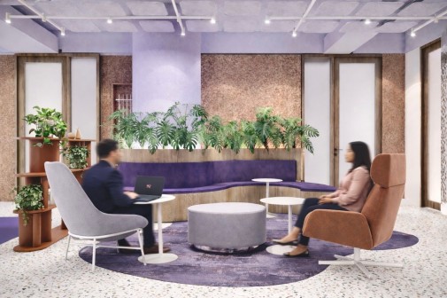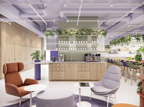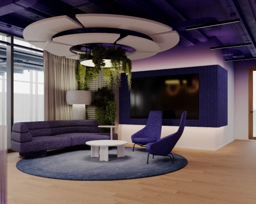 Przestrzeń, którą otwiera się biuro została zaprojektowana jako rodzaj wizytówki, w sposób nowoczesny, ale równocześnie przyjazny w odbiorze. Centralnym elementem jest minimalistyczna recepcja zestawiona z naturalnym drewnem, które ociepla aranżację. Ciemny fiolet i gradientowe przejścia na ścianie, które nawiązują do identyfikacji marki, dają poczucie energii ale równocześnie kameralnego ciepła – szczególnie w strefie oczekiwania. Przestrzeń z miękkimi, sofami, fotelami o wyrazistej formie i stolikami kawowymi – tworzy miejsce komfortowe i gościnne. To wrażenie potęgują organiczne formy oświetlenia sufitowego i wisząca roślinność, która daje wrażenie „żywego” wnętrza. To nie jest klasyczna recepcja korporacyjna – raczej nowoczesny lounge nastawiony na pozytywny pierwszy kontakt i budowanie relacji.