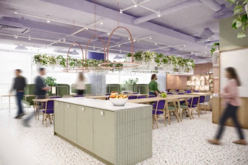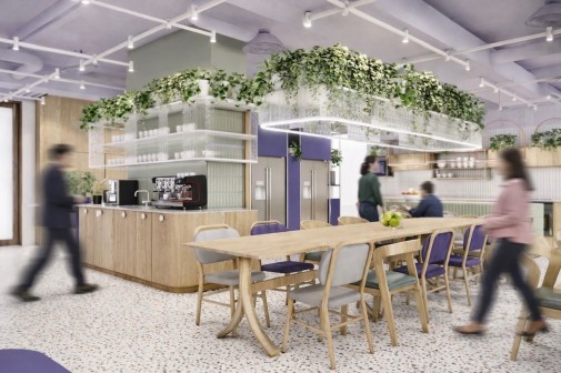 Jadalnia płynnie łączy się z kuchnią, dlatego strefa pełni wiele funkcji jednocześnie, odpowiadając na potrzeby współczesnego biura hybrydowego.