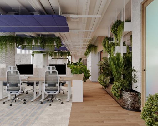 Rośliny – w formie donic, jak i większych instalacji – pełnią naturalną funkcję separatorów, pozytywnie wpływając na akustykę i bardziej przyjazny klimat pracy.