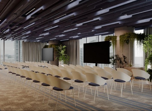 Większe przestrzenie spotkań i prezentacji zostały zaprojektowane w sposób możliwie elastyczny. Mogą służyć jako miejsce przeprowadzania warsztatów, spotkań zespołowych, jak i wydarzeń firmowych. Kluczową rolę odgrywają tutaj rozwiązania techniczne i możliwość dopasowania przestrzeni do różnych potrzeb.