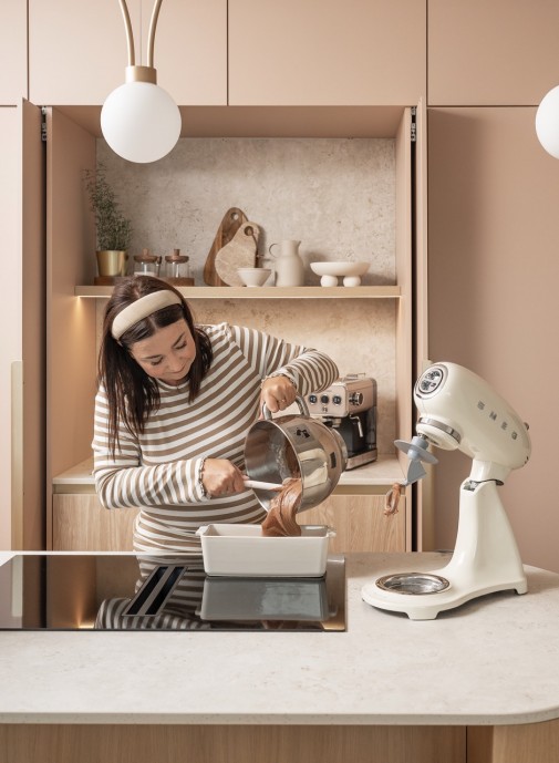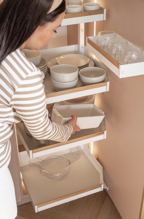 Kiedy wszystkie składniki są już przygotowane, pora sięgnąć po sprzęty, które czekają tuż obok – równie uporządkowane i równie łatwo dostępne. Po drugiej stronie kuchennej zabudowy, sprytnie ukryte w systemie PLENO MAXI PLUS, czekają kuchenni pomocnicy. Jedno pełne wysunięcie i robot kuchenny, miski oraz formy do pieczenia stają się częścią poranka. Nie ma szukania, grzebania, przekładania. Jest tylko przyjemność.
