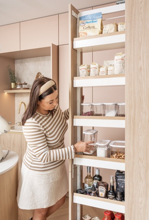 - W szafie DISPENSA czekają produkty sypkie: mąka, cukier, kakao, a obok poukładane puszki i pudełka z dodatkami. Wystarczy jedno pociągnięcie, by zobaczyć całą zawartość i sięgnąć po to, czego akurat potrzeba – podpowiada ekspertka Peka.