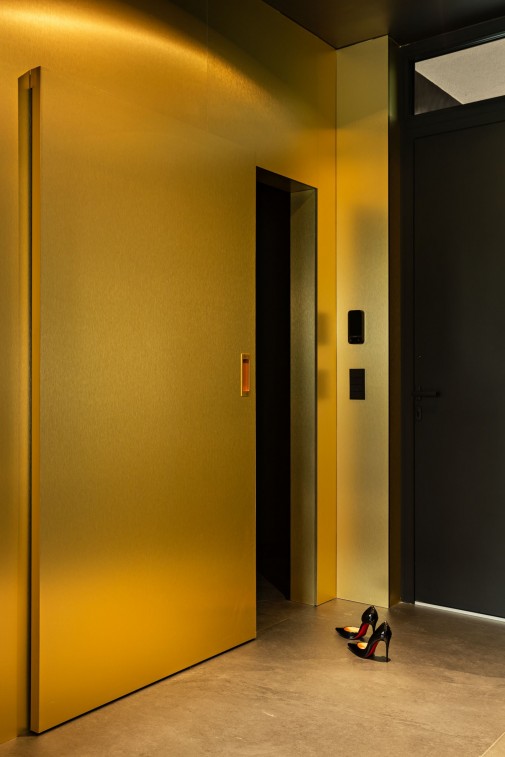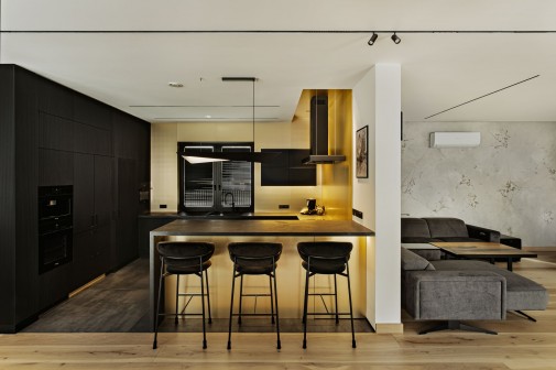 Estetyka wnętrza opiera się na zestawieniu głębokiej czerni, naturalnego jesionowego drewna oraz złotych akcentów. Pojawiają się one w postaci okładzin ściennych i detali wykończeniowych. W projekcie wykorzystano wielkoformatowe płyty kamienne oraz spieki, m.in. Grespania Coverlam Annapurna Negro, którymi wykończono także ukryte drzwi. Bogactwo faktur buduje subtelny, wielowarstwowy charakter wnętrza. Ryflowane fronty zabudowy kontrastują z gładkimi taflami szkła i matowymi powierzchniami kamienia. Istotną rolę odgrywa również światło, zarówno naturalne, przenikające przez lekkie, półtransparentne tkaniny, jak i precyzyjnie zaprojektowane oświetlenie liniowe i szynowe.