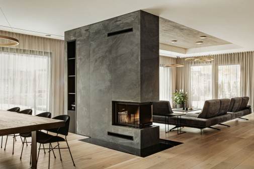 Centralnym elementem strefy dziennej jest kominek wpisany w monumentalną, kamienną bryłę, która porządkuje przestrzeń salonu i jadalni. Wokół niego zorganizowano część wypoczynkową z niskimi, miękko tapicerowanymi sofami.